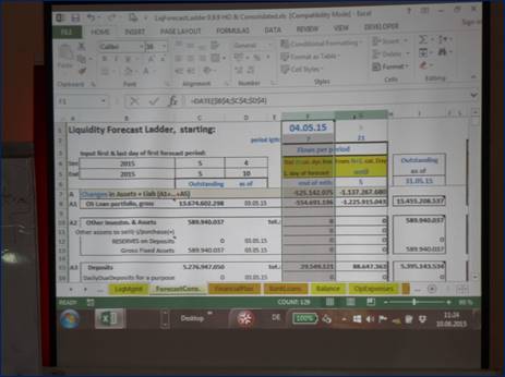 Together with Dr. Birgit the class projected likely changes in outstanding deposits and other quantities determining the future level of liquidity for various scenarios. This lead to lively discussions between the participants who assisted each other in filling in the parameters of the tool.